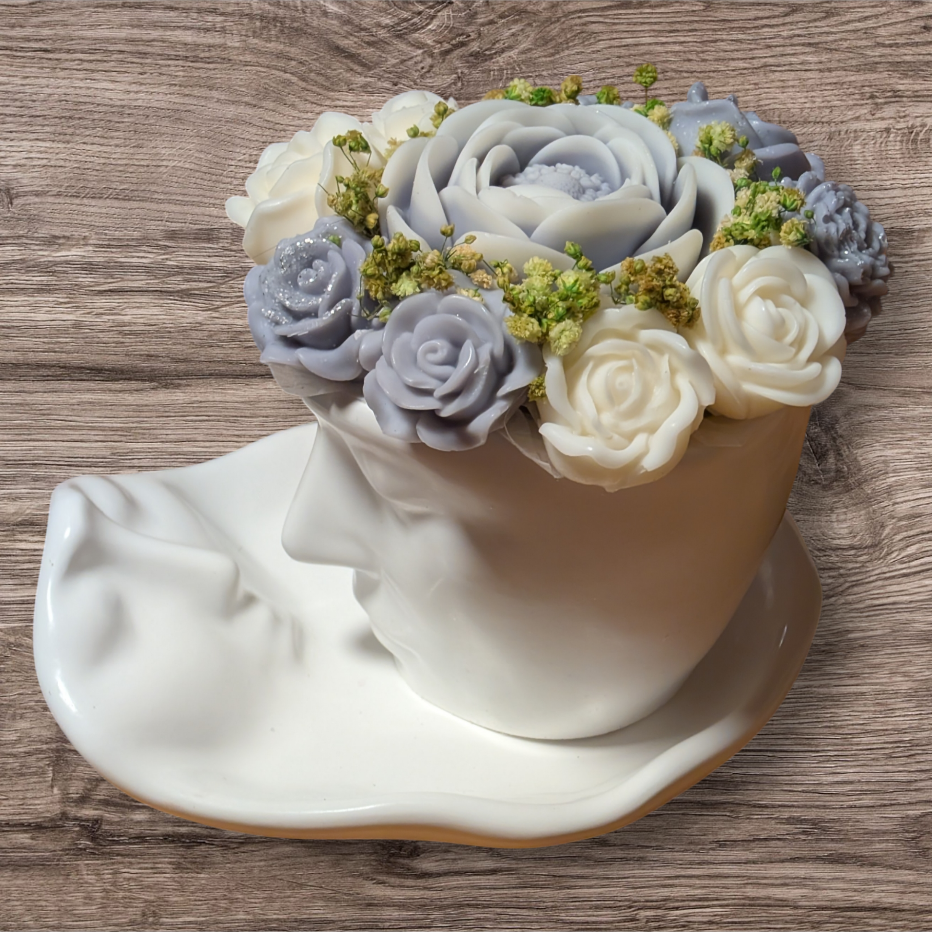 Romantischer Blumentopf "Gesichter" mit Wachsblütenweiß/grau
