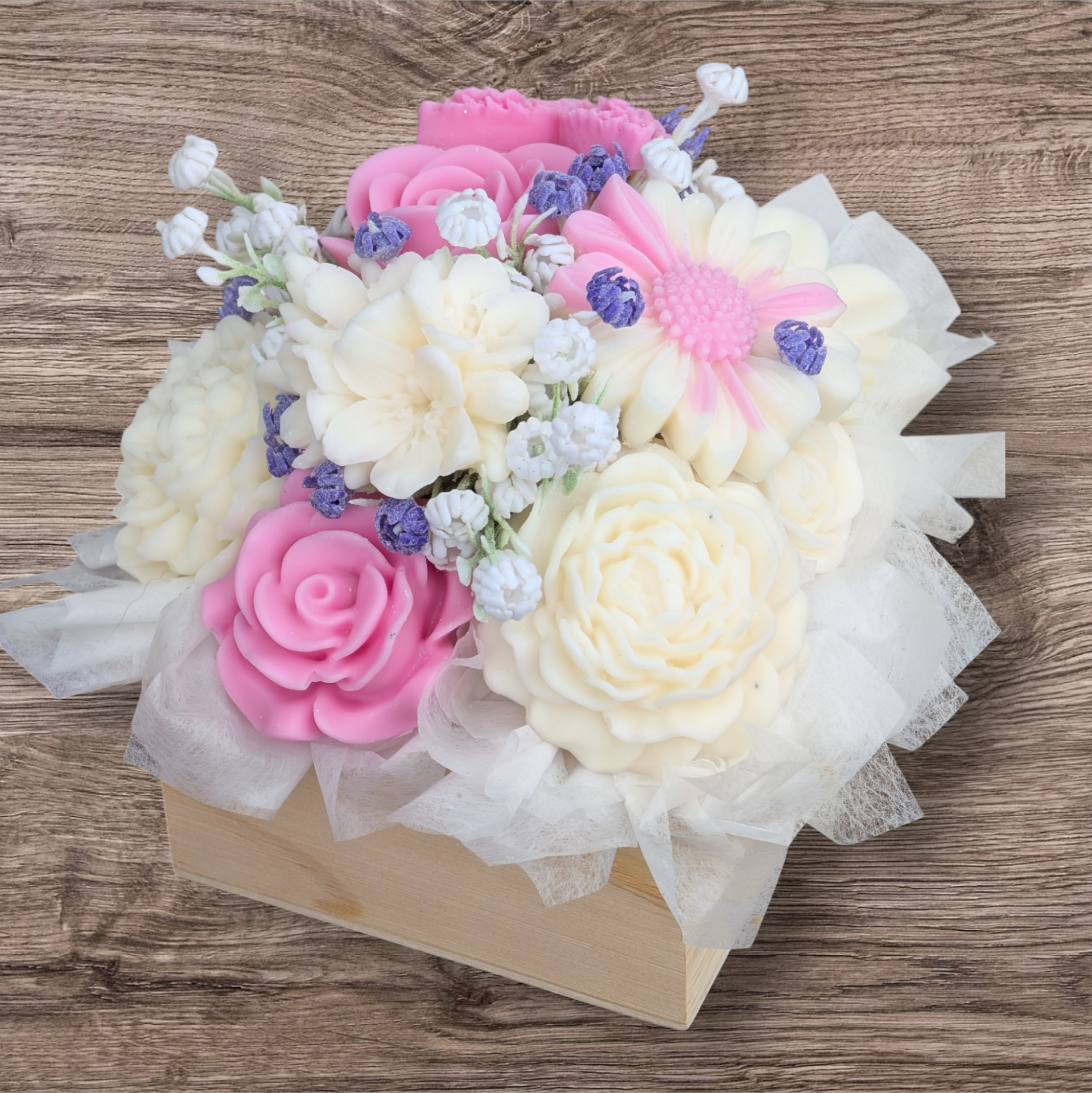 Wachsblumengesteck im Naturholzkästchen weiß/rosa "S"