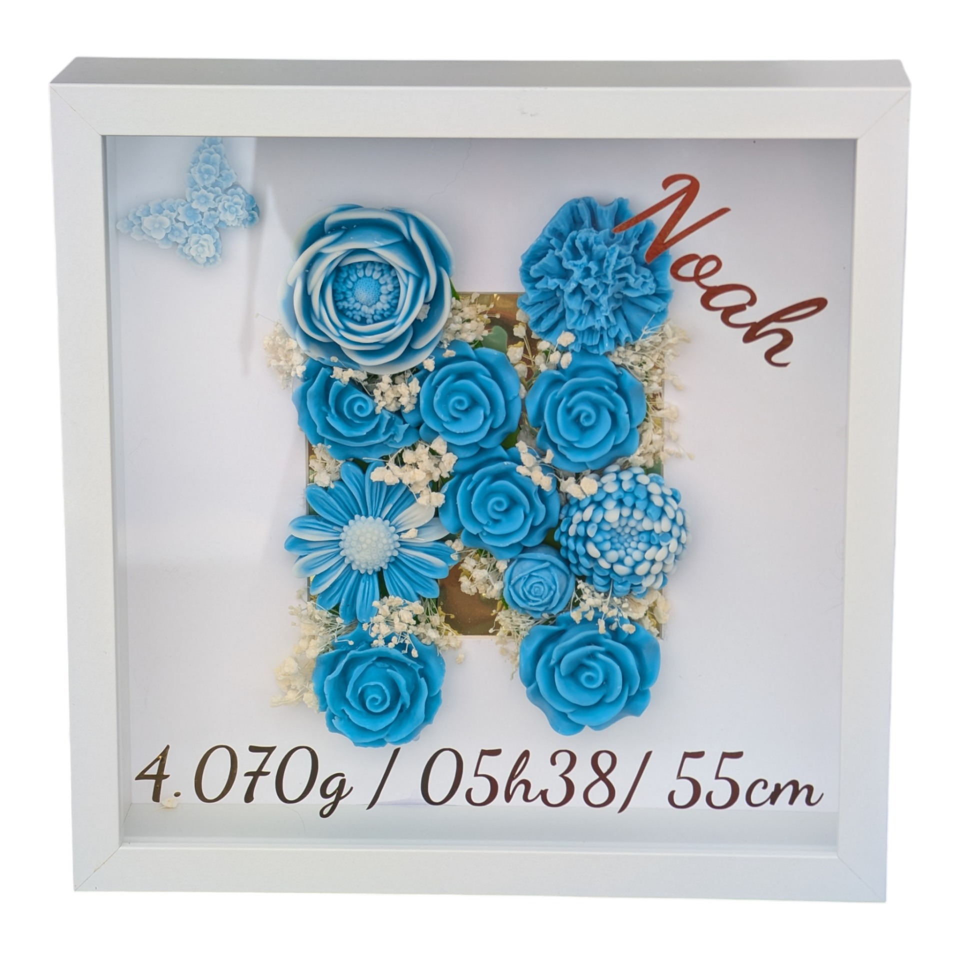 Unser Willkommensgeschenk für Babys ist in den Farben Rosa, Blau oder in Ihrer Wunschfarbe erhältlich. Der Anfangsbuchstabe des Namens wird mit zarten Wachsblumen verziert. Auf der Scheibe des Bilderrahmens sind der Name, das Geburtsdatum, das Gewicht, die Geburtsuhrzeit und die Größe des Babys verewigt. Dies macht jedes Geschenk zu einer unvergleichlichen Erinnerung an einen der schönsten Momente im Leben.