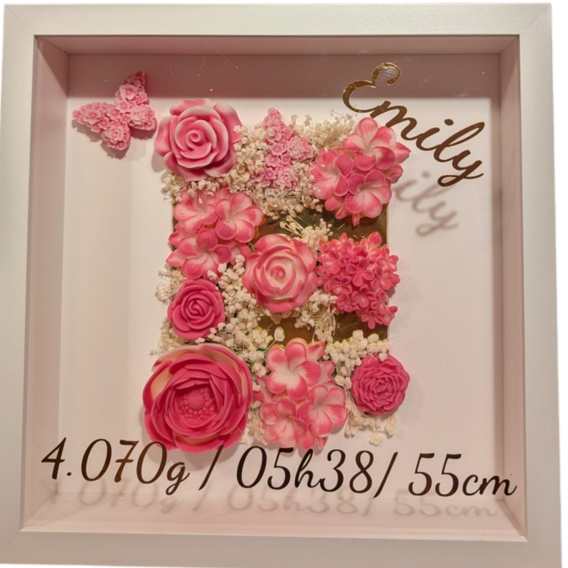 ✨ Baby Welcom Blumenbox - Ein eleganter Bilderrahmen die als Willkommensgeschenk ideal ist. Die Box enthält rosa/blaue (oder Wunschfarbe) Wachsblumen und einen Schmetterling. Perfektes und besonderes Geschenk zur Geburt.🌸